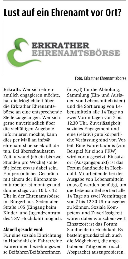 Im August diesen Jahres hat die Rheinische Post darüber berichtet, dass die Erkrather Ehrenamtsbörse, die seit 2014 - initiiert von mehreren Sozialträgern - erfolgreich die Bedarfe und Interessenten ehrenamtlicher Tätigkeiten vernetzt und vermittelt, selber dringend personelle Unterstützung benötigt. Schirmherr der Börse ist der Bürgermeister Christoph Schultz.